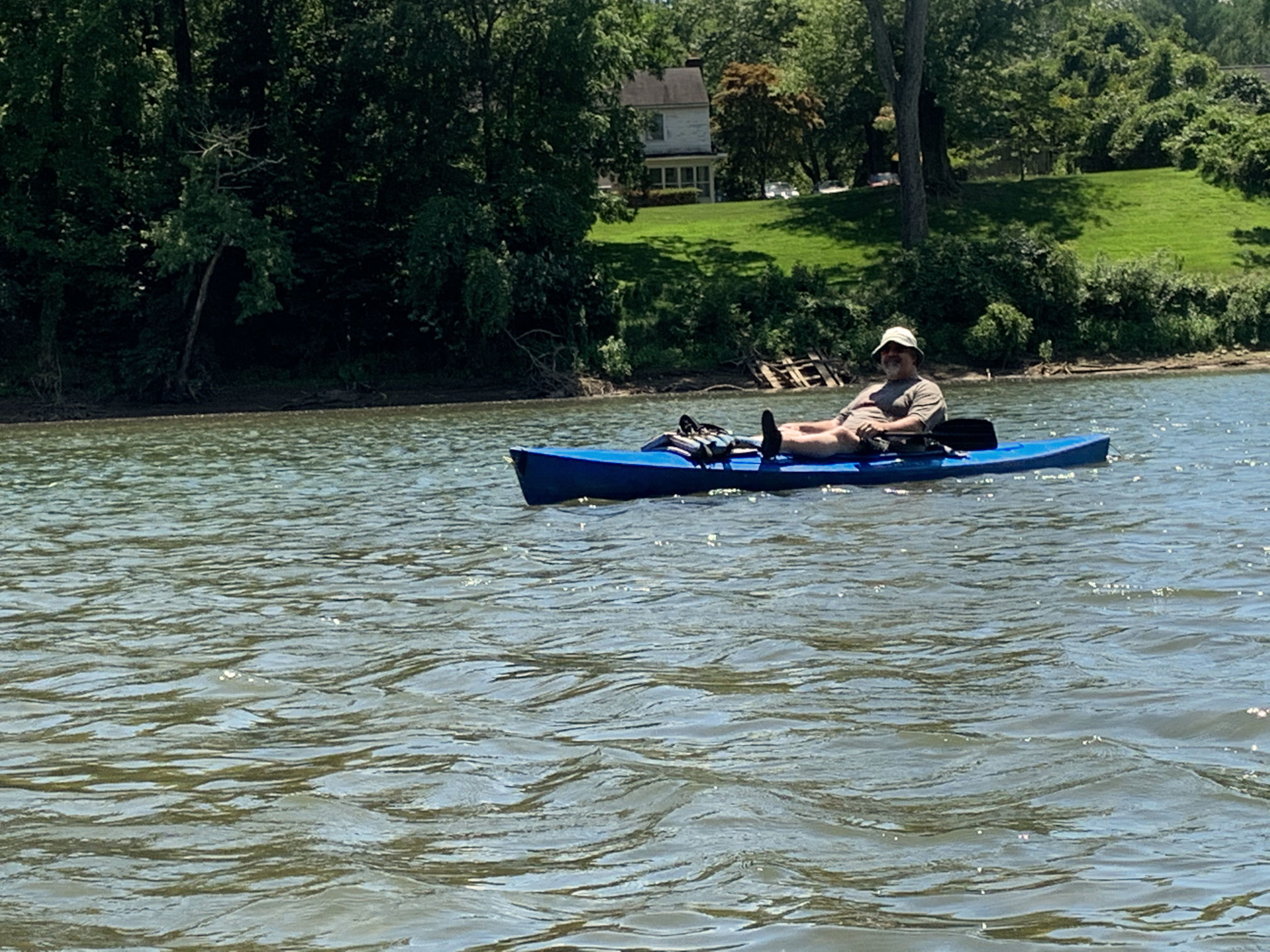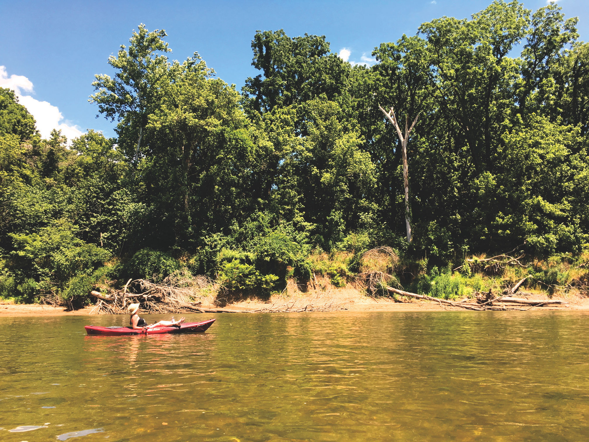 After a short stop at the top of the island, which included some cheese and crackers, along with some frozen grapes (excellent snack for a hot day, I must say), we got back in the water and started paddling back towards to the truck. Obviously, heading downstream was much easier than paddling upstream. The last 200 yards towards the tip of the island we were heading into a breeze that had suddenly picked up, and had to put more effort into paddling to keep moving forward.